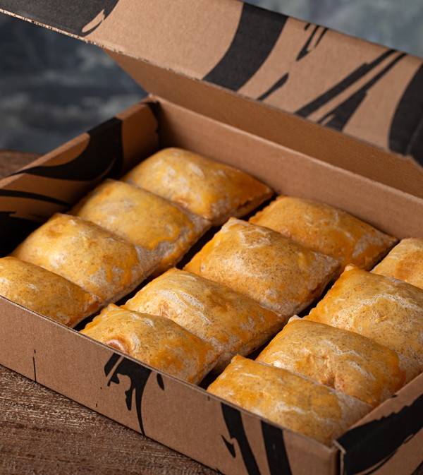 Massa de pastel integral recheada com berinjela, abobrinha, pimentão, tomate, passas e azeitona.