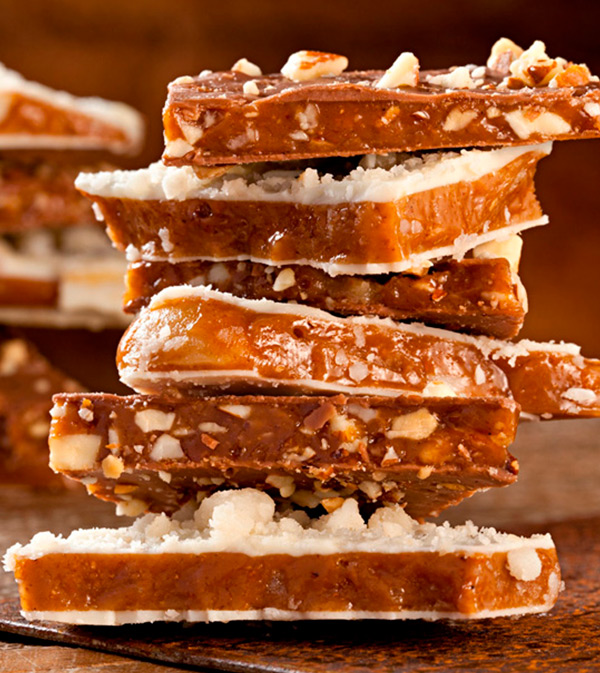Caramelo duro coberto com chocolate branco e castanhas de caju.