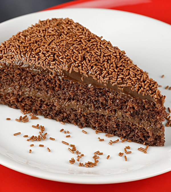Pão de ló de chocolate recheado com brigadeiro e coberto com brigadeiro e chocolate granulado belga.